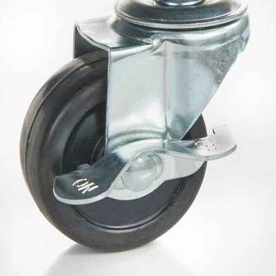 - Features two drawers, spice rack, two towel bars with locking caster wheels for safety