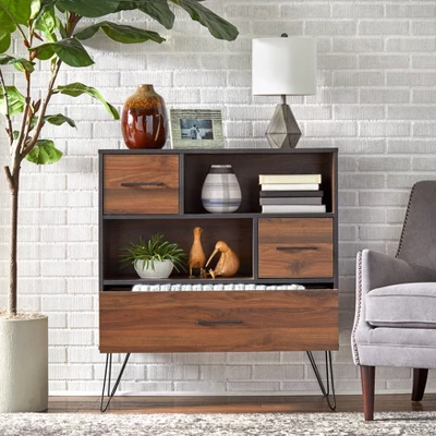 Showcase your living area with the Vintage Living Cabinet for a touch of Mid-Century modern style. Ideal for living room and contemporary interiors, this cabinet offers spacious storage. Three drawers allow room for a multitude of items large and small. While the two open shelves are perfect for decorative accent pieces. Laminated particleboard construction with metal wire frame legs, this cabinet is crafted in a complementary two-tone walnut and black finish.